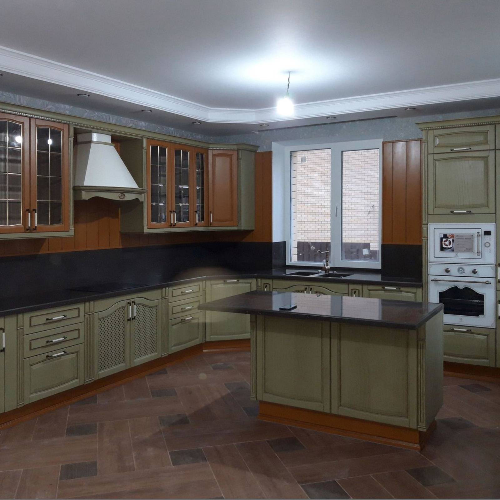 Кухня оливкового цвета может быть выполнена в разных стилях. Такой гарнитур будет гармонировать с классикой, барокко, как на нашем фото, минимализмом, хай-теком, модерном, провансом и кантри — есть много вариантов дизайна кухни. Пример классического оформления на фото ниже.