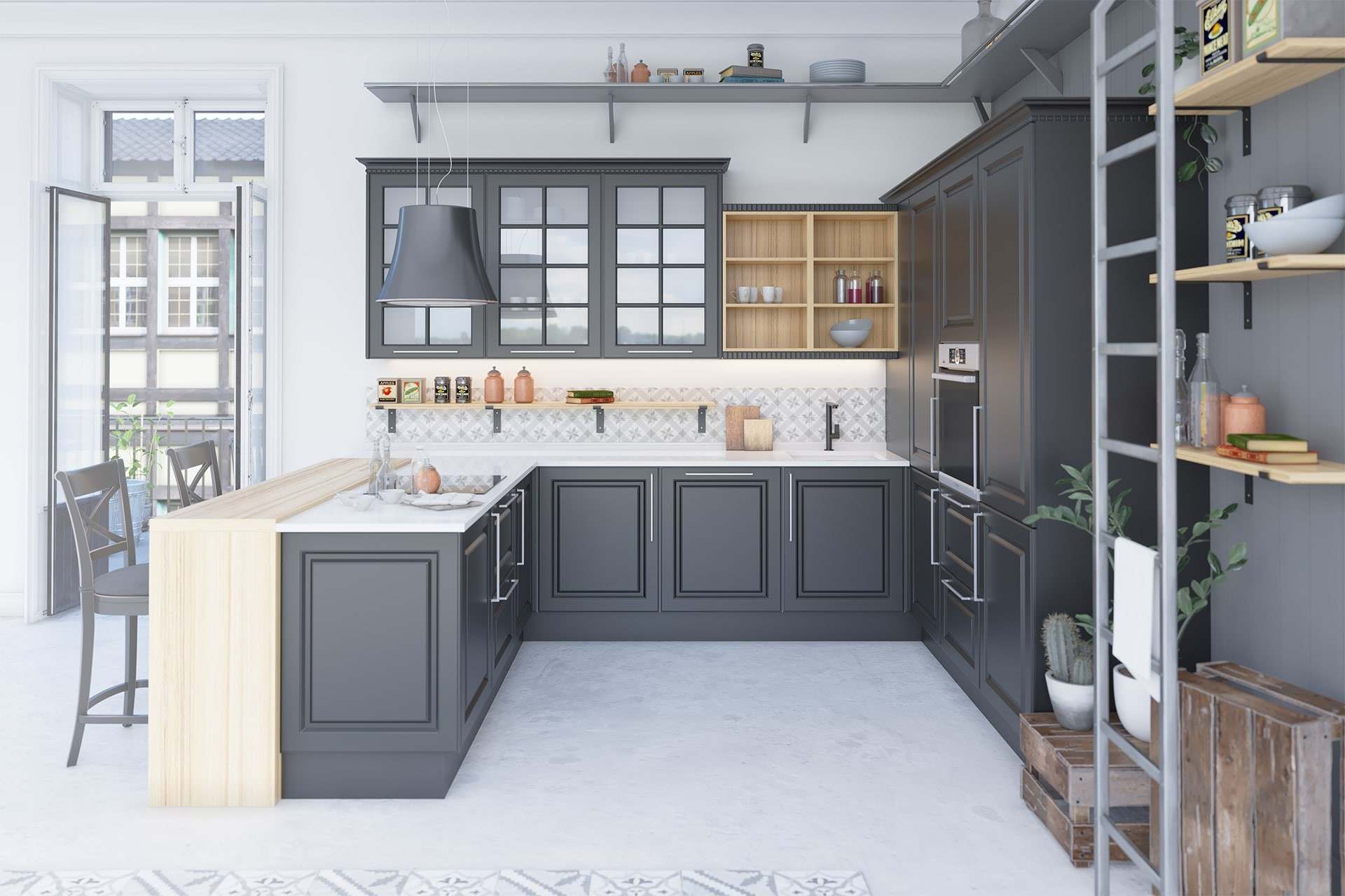 Серый цвет универсален и часто используется в интерьерах кухонь. Темно-серый – это цвет природного камня или сырого бетона. Такие фасады выглядят эффектно. Серый нейтрален и подходит для гарнитуров в любом стиле. При изготовлении мебели на заказ его часто дополняют имитациями дерева.