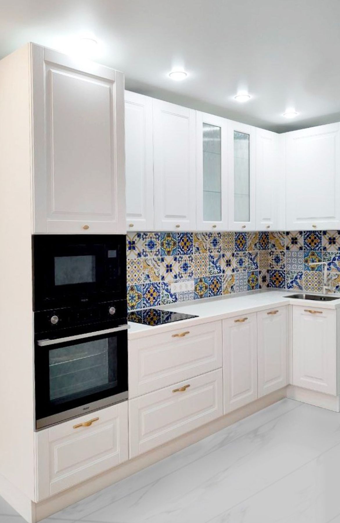 - Она красивая. Благодаря грамотной работе наших менеджеров-дизайнеров угловая кухня будет очень красивой и стильной. Она станет украшением даже очень ограниченного пространства. Мы предлагаем больше 1200 вариантов фасадов: из МДФ и ЛДСП, ламинированные, с отделкой шпоном (под массив дуба или другого дерева), пластиком, эмалью или другими материалами. Доступны любые стили – от модерна или классики до лофта или сканди.
